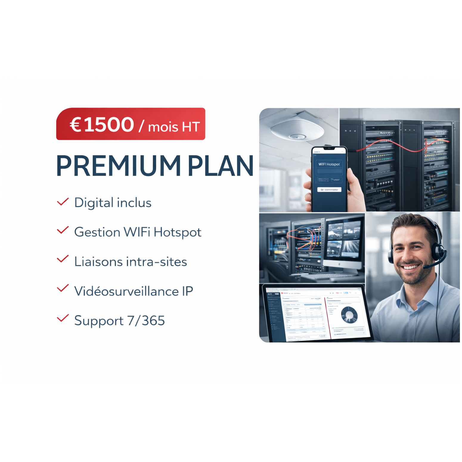 Cette offre intègre l’ensemble des services de l’offre Digital, complétés par des mécanismes avancés de réseau, de WiFi professionnel, de vidéosurveillance IP et un support technique continu 7 jours sur 7.